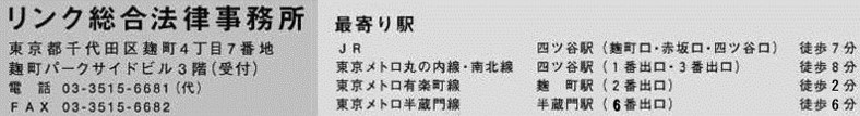 麹町パークサイドビル3階 リンク総合法律事務所 TEL 03-3515-6681 FAX 03-3515-6682 |