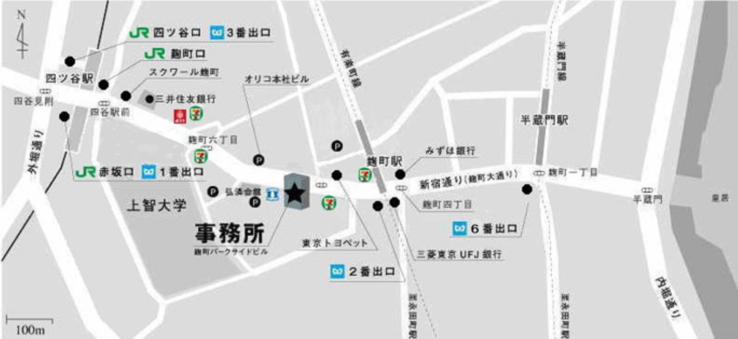 ⇒皇居の方向に、大人の足なら徒歩7分~8分。 麹町大通り(新宿通り)南側の歩道を歩いていただき、弘済会館(現在工事中で駐車場も閉鎖中です。)を経て、ローソン麹町5丁目店を過ぎ、次の麹町大通りに面したビルです。住友不動産のビルではありませんのでご注意ください。